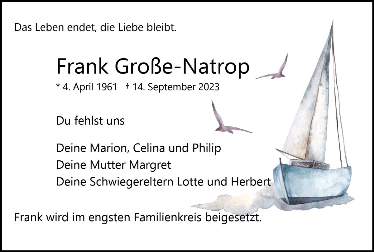I just now read about the passing of Frank Große-Natrop. And I'm totally shocked.I meet him first in 1988 and remember his sence of humor, his relaxed view of "working in an big company". He gave me the chance to grew in my early working days and later on in Bad Kreuznach. I remember the days, with his laughing, and in Dreieich at a summer-event(where we talked nearly the whole night) and at a funny birthday-party at his place.He was so normal, relaxed and a very kind person in his position. I'm very thankful to meet him and for what he did for me and all others that days.So sad!My deepest condolance going to Marion and the whole family. Klaus