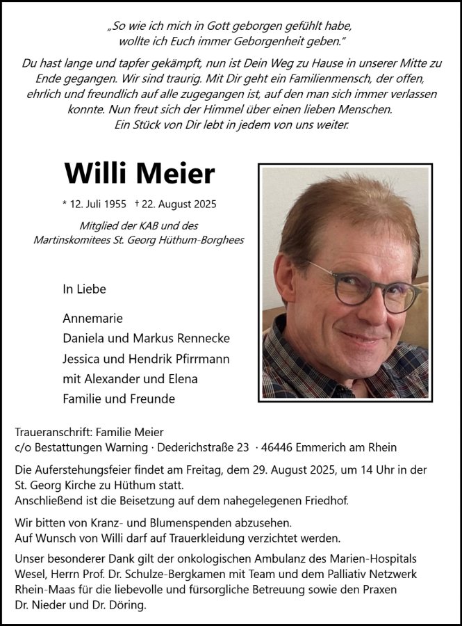 Dass wir Abschied nehmen müssen von Willi, erfüllt uns mit Trauer. Wir werden ihn, der mit uns unterwegs war als Freund, als Wegbegleiter, als Helfer vermissen.